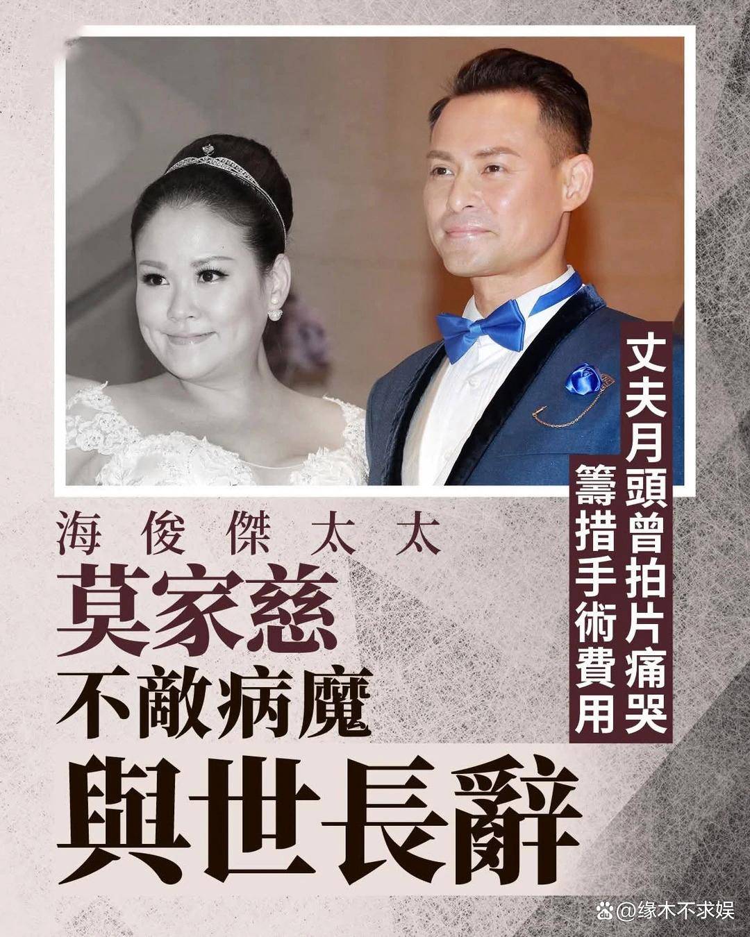 莫家慈并非是在大火中丧生,而是不敌病魔辞世。就在11月上旬海俊杰发布求救视频,称妻子患急性肝硬化,需要150万手术费,而自己还缺70万。海俊杰为了给妻子筹手术费,声泪俱下的求捐款,古天乐、郭富城等人也施以援手。没想到手术后还是去世了。