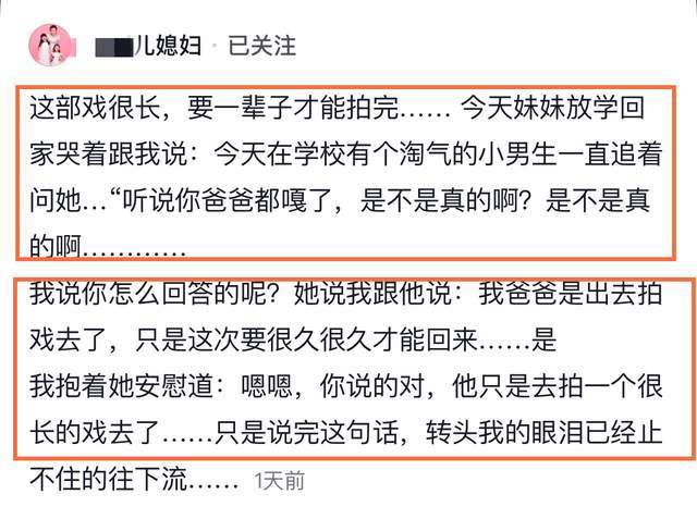 “我说你怎么回答的呢?她说我跟他说:我爸爸是出去拍戏去了,只是这次要很久很久才能回来,于是我抱着她安慰道:嗯嗯,你说的对,他只是去拍一个很长的戏去了,只是说完这句话,转头我的眼泪已经止不住的往下流。”