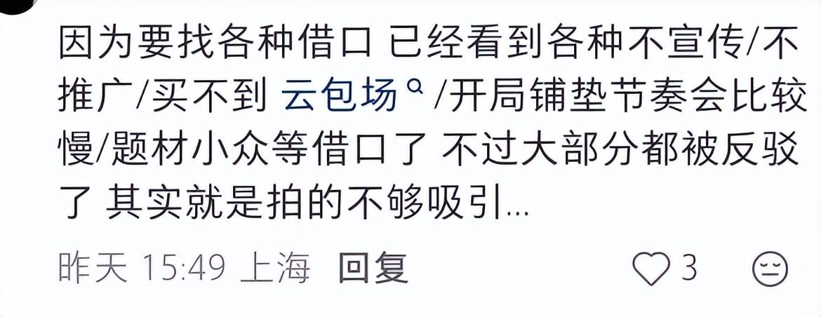 一时间热巴的粉丝也是格外焦虑,想出很多借口来挽尊,一会儿质疑现在内娱的环境不行,一会儿质疑题材有问题,甚至还质疑起了播放平台的问题。