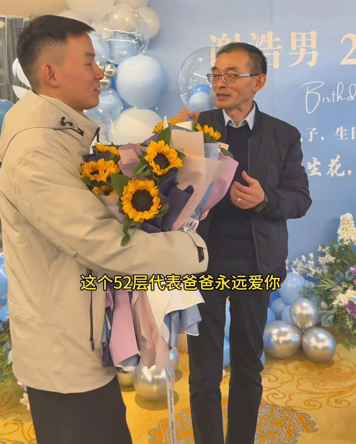谢岳把谢浩男带到52层的酒店,并且在包间门口有5位工作人员、分别手持一束27支的鲜花。谢岳对这些数字给出了解释,原来父爱也可以细腻。