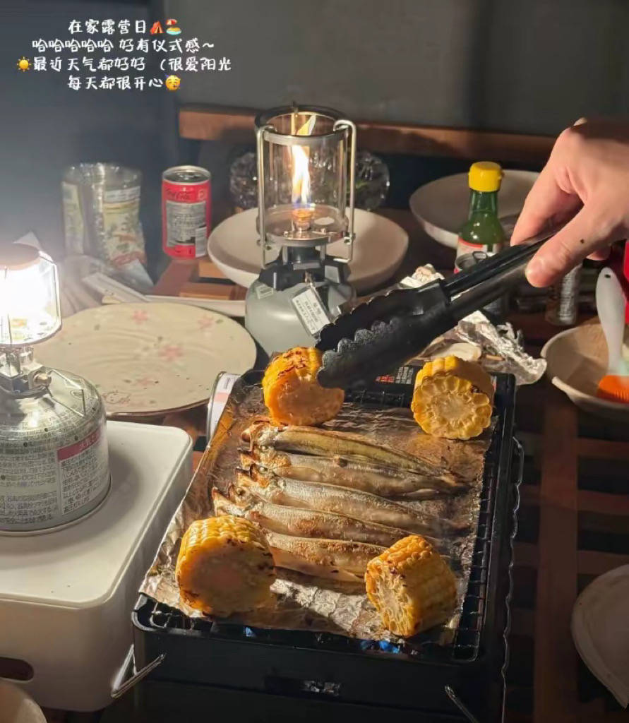 昏暗的灯光下,火炉滋滋的烧烤着食物,一旁的摆盘也很精致。足以看出懒懒也是讲究细节的人,特别注重生活的仪式感。