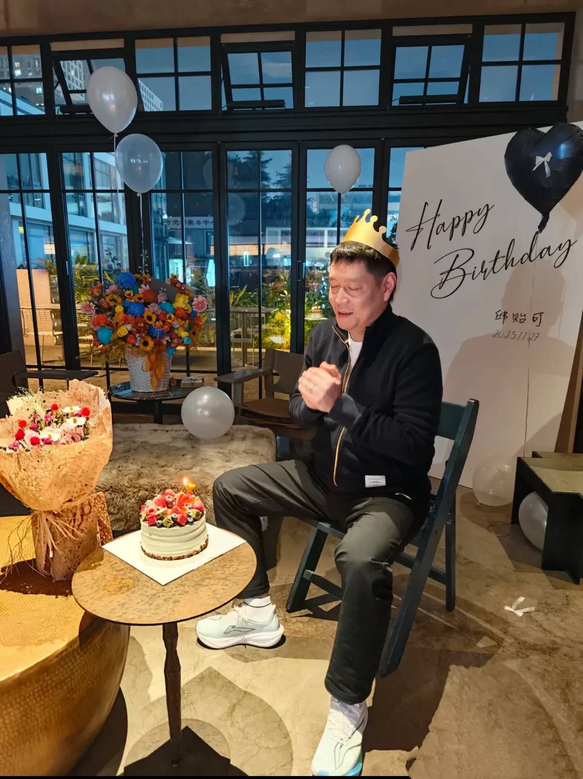 邱贻可的生日宴,安排在一家豪华餐厅、大大的落地窗看着好气派。他穿着一身黑色运动装,坐在小椅子上,闭着眼睛对着蛋糕许愿。
