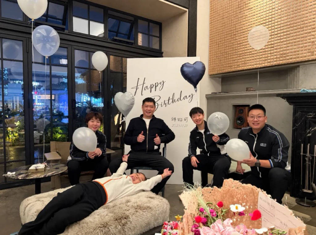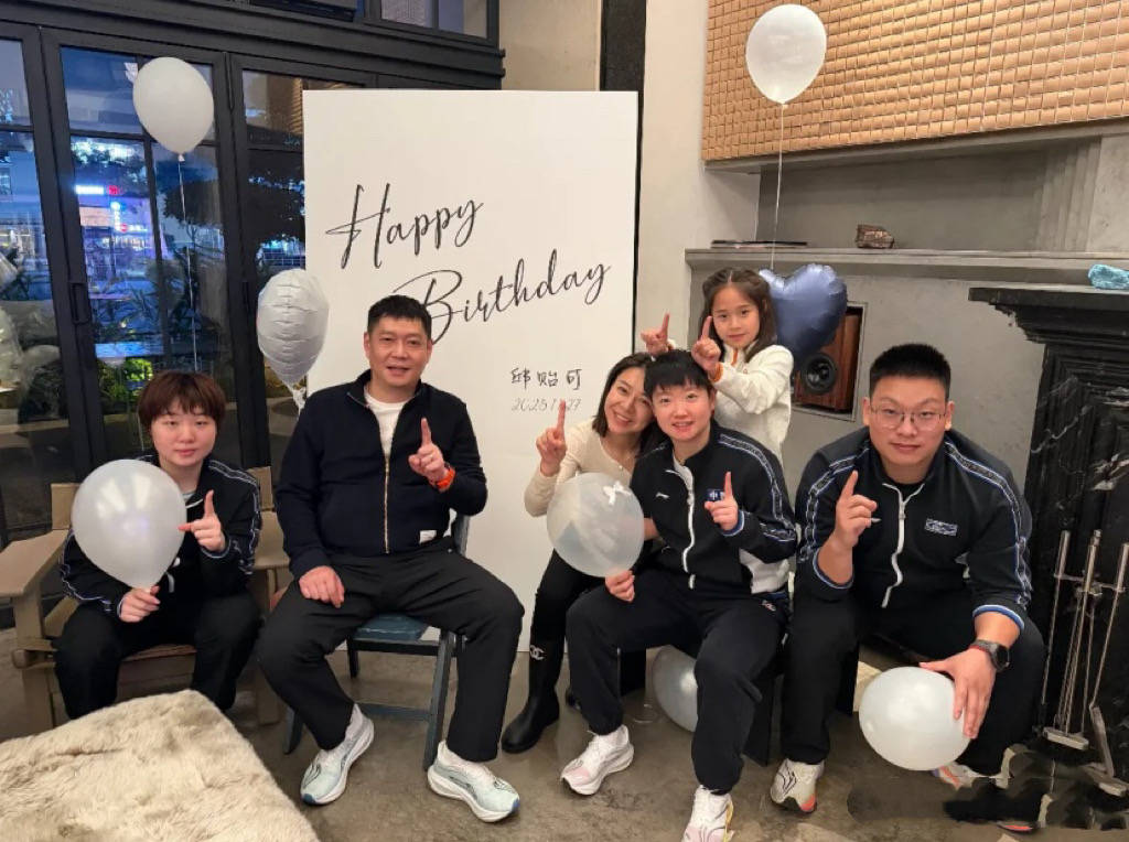 作为邱贻可的得意门生,孙颖莎蒯曼都来了,还有几位队员,他们都穿着队服来给邱指导庆生。孙颖莎坐在最靠近师父的位置,手里拿着粉色气球,笑起来特别甜。
