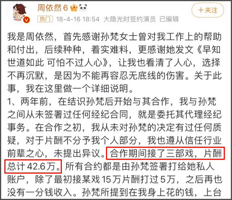网友深扒周依然过往,发现她曾和前经纪人孙梵闹过合同纠纷,双方各执一词,但从字里行间不难发现,周依然从进圈开始,资源就非常好,经纪人拿不到的热剧试镜机会,她自己有别的渠道获得;