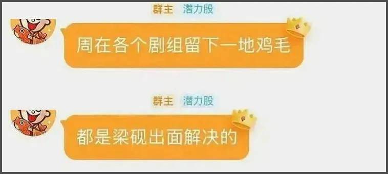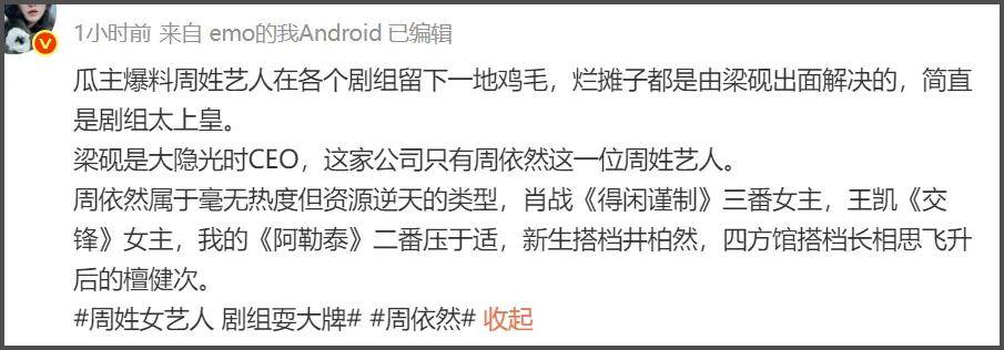 最近有网友爆料周姓女艺人在剧组搞特权,事后还得经纪人出面解决。随后未打码的爆料图流出,所谓经纪人就是周依然公司总裁梁砚,而这个公司签约艺人里,姓周的也只有周依然。博主爆吐槽周依然在剧组耍大牌,堪称“剧组太上皇”。