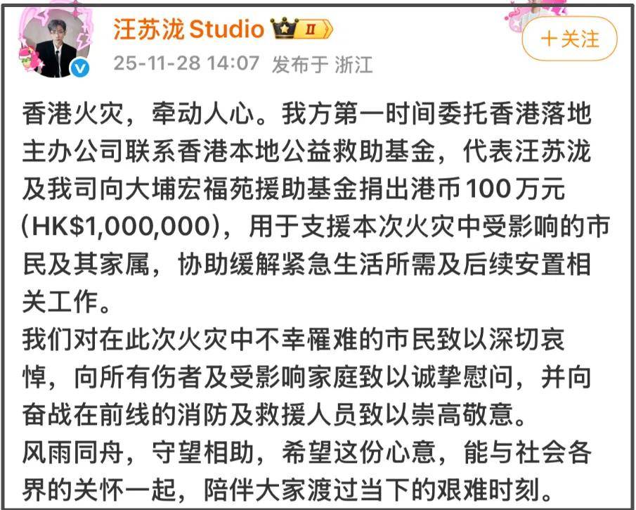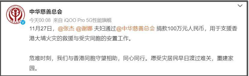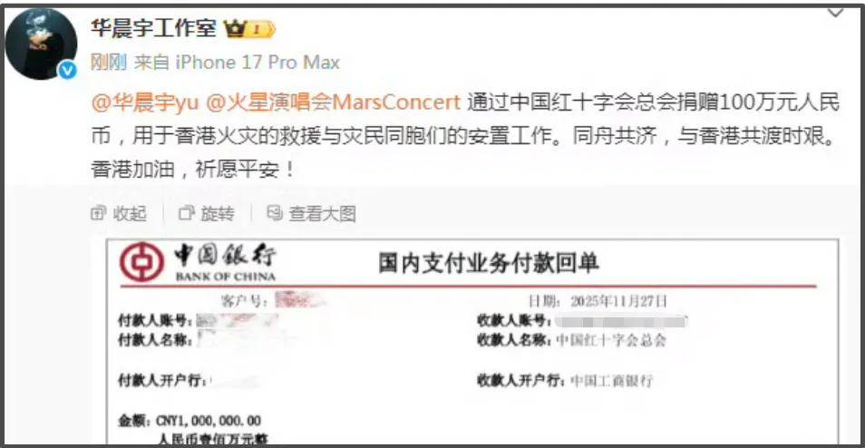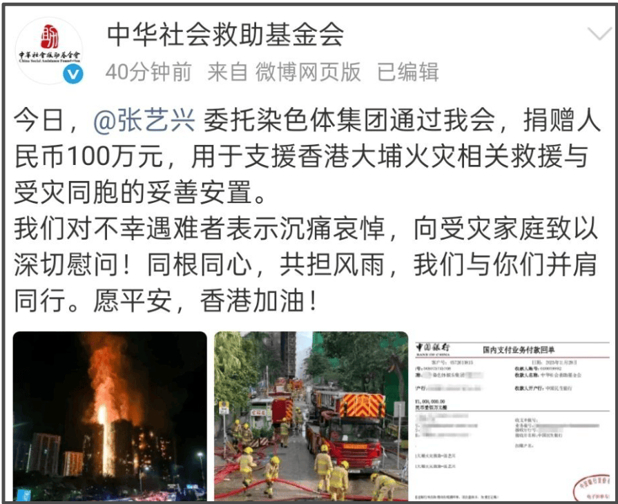 张艺兴捐款100万人民币,用于支援香港大埔火灾相关救援与受灾同胞的妥善安置。