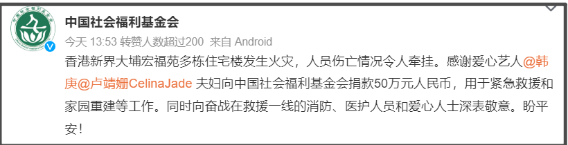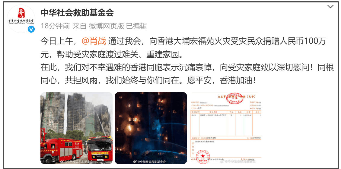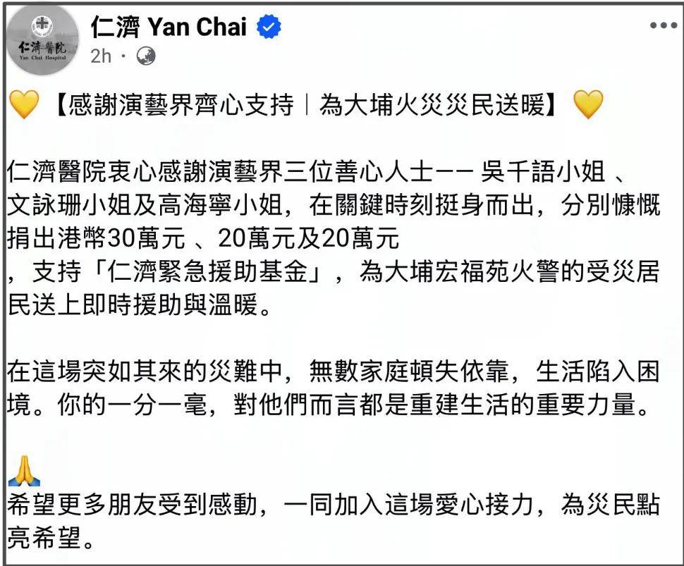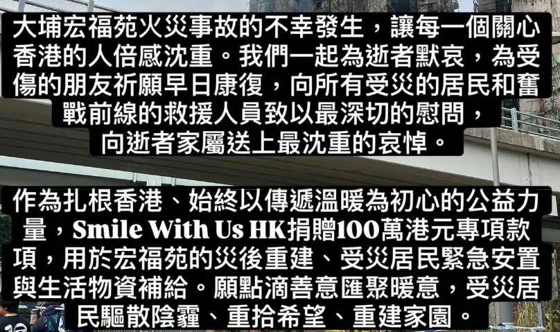 随着香港大埔火势得到控制,外界逐渐把关注重点放在后续救援和受灾民众安置上,越来越多明星参与捐款,希望能够帮助到更多受灾民众。