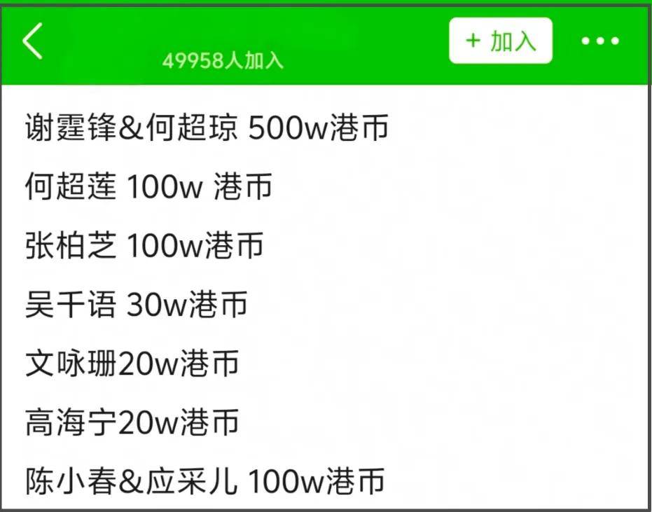 ——张柏芝捐款100万港币;赵雅芝捐款50万港币;吴千语捐款30万港币;文咏珊捐款20万港币;高海宁捐款20万港币;杨千嬅捐出首场演唱会门票收益以及六场演唱会周边盈利,具体金额未知,算到这里,捐款总金额就突破2800万了。