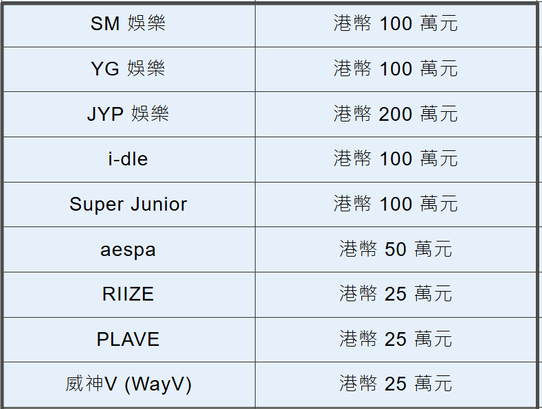 JYP、SM、YG、HYBE等韩国娱乐公司纷纷以公司名义捐款,近10个韩国组合以团体名义捐款,总金额超1000万港币,折合成人民币近千万,加上内娱明星,捐款金额已然超过3800万。另外,MAMA主办方也捐赠了2000万港币 。