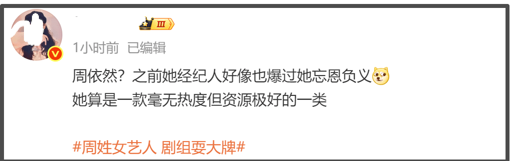 根据爆料人透露的过两天马上要上的电视剧、和童姓女演员合作等信息,网友将该周姓女演员锁定为周依然,网友扒出她和胡先煦合作的《即刻上场》的确在爆料不久之后播出。另外,在《有你的时光里》,周依然和童瑶饰演姐妹,有激烈争吵动手的画面。