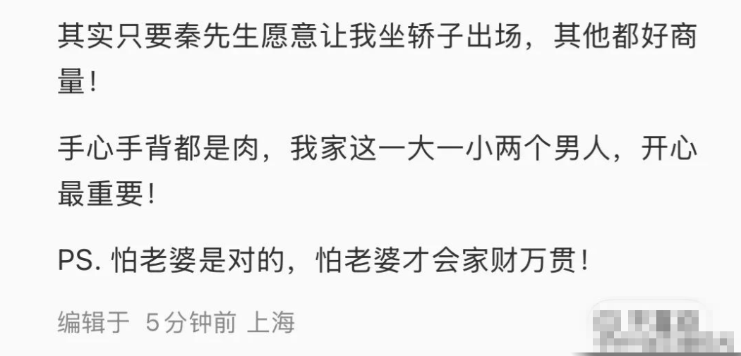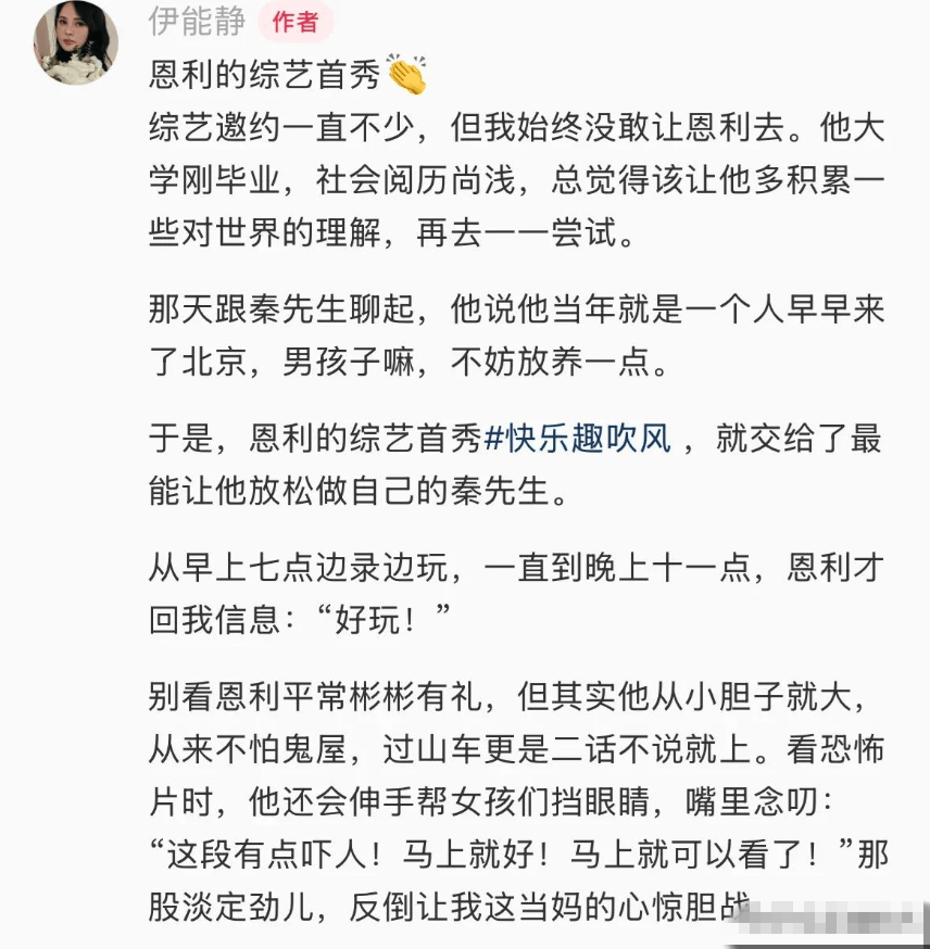 看秦昊的满满求生欲就知道爱惨了伊能静,每次秦昊有新作品或者恩利有什么设计要宣传,伊能静的小作品就写的满满当当,总体来说都是为了家人好。
