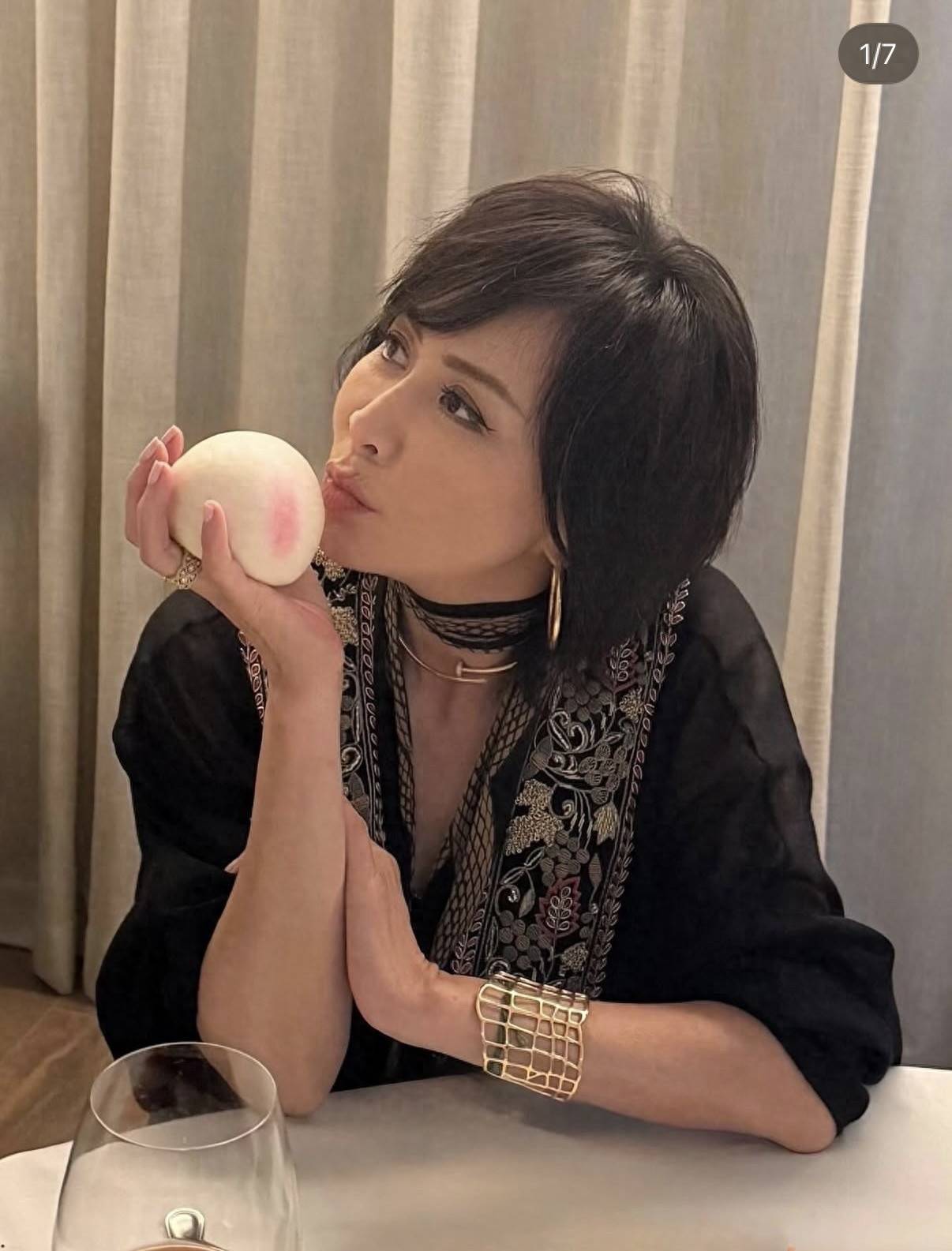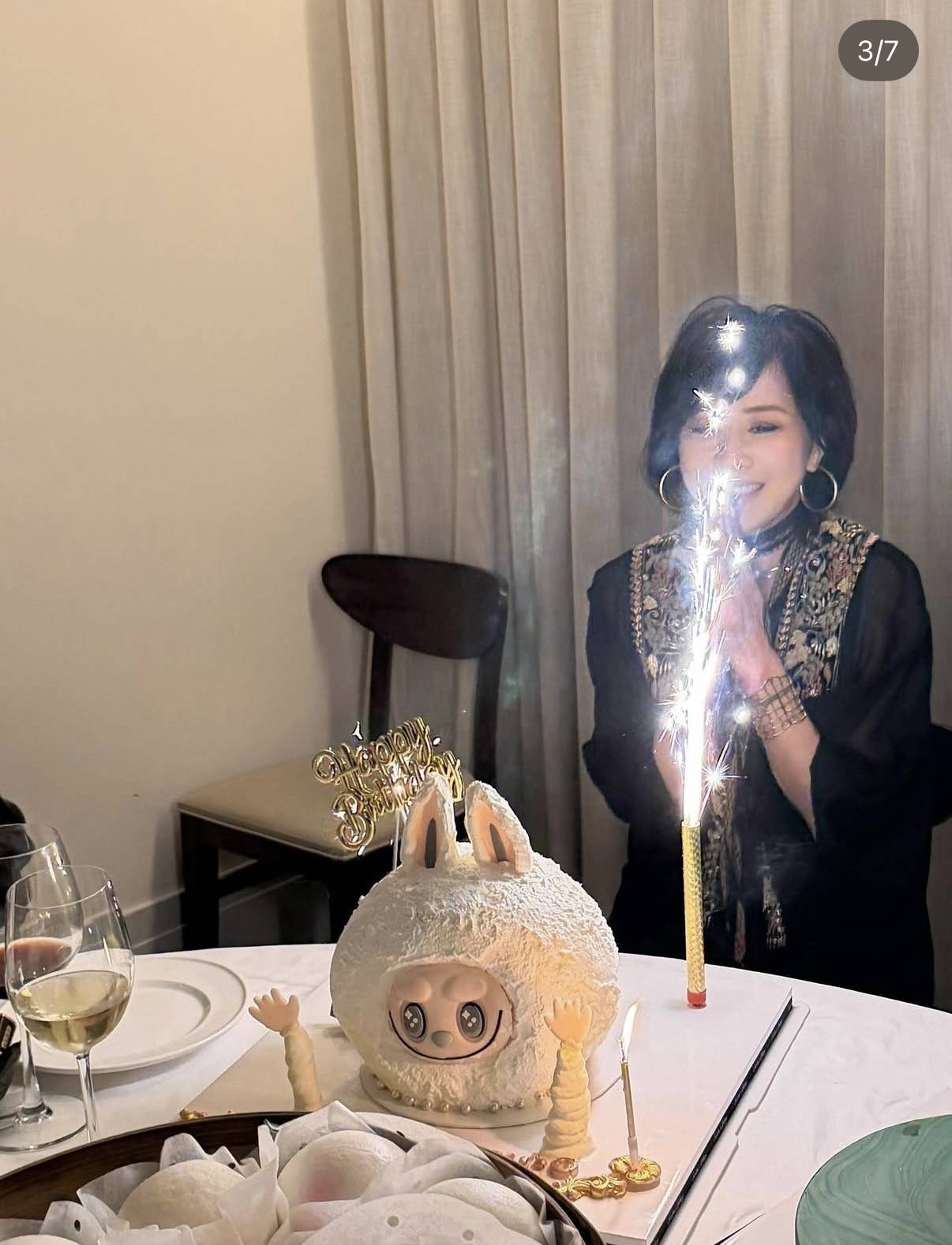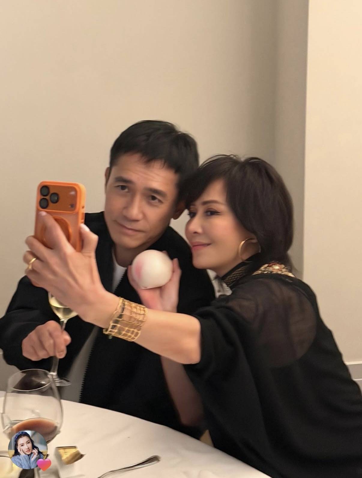 从现场合照来看,众人关系都很好,合照的时候刘嘉玲与吴志诚坐在第一排,其他人站在后排,其中雷林静怡还单手搂着吴志诚,可见彼此相识已久。切蛋糕环节,刘嘉玲对着绽放烟花的Labubu蛋糕许愿,仪式感满满。除此之外,她还留下了不少的照片,包括自己拿着寿桃包的自拍照,另外还有梁朝伟出镜的夫妻合照。这张照片很特别,刘嘉玲一只手拿着寿桃包,一只手拿着手机自拍,梁朝伟也出镜,他拿着香槟,夫妻俩贴头自拍,这一幕很温馨,自然,没想到还被在场的友人抓拍了下来。