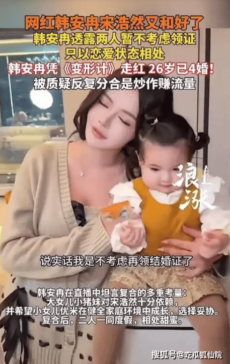 网红圈的 “感情剧本” 又更新了!11 月 27 日,凭借《变形计》走红的韩安冉在浙江一场直播中,轻描淡写官宣与第四任丈夫宋浩然复合,却抛出重磅炸弹:“暂不考虑领证,只谈恋爱”。消息一出,# 韩安冉宋浩然复合# 话题瞬间空降热搜,网友炸锅:“这分分合合的戏码演了多少遍?从结婚到离婚再复合,每次都能上热搜,流量密码算是被你玩明白了!” 26 岁历经 4 段婚姻,感情生活比电视剧还跌宕,这次 “复合不领证” 的操作,究竟是真心想好好过,还是又一场精准的流量收割?