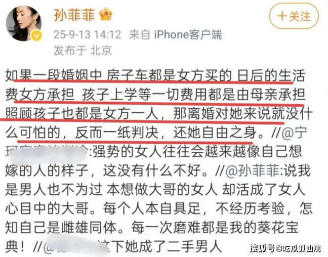 9 月 13 日凌晨,沉寂已久的演员孙菲菲突然在微博连发数篇长文,用一句 “本想做大哥的女人,却活成了女人心目中的大哥” 撕碎了维持 11 年的 “豪门婚姻”