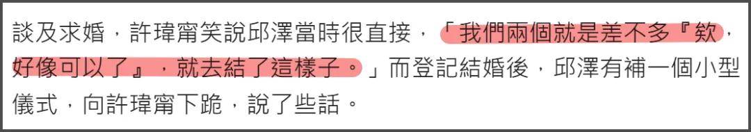 邱泽的求婚非常低调,许玮甯表示两人是“水到渠成”,觉得到时候了就去结婚了,只是在登记结婚之后,邱泽才单膝下跪表了一番心意。
