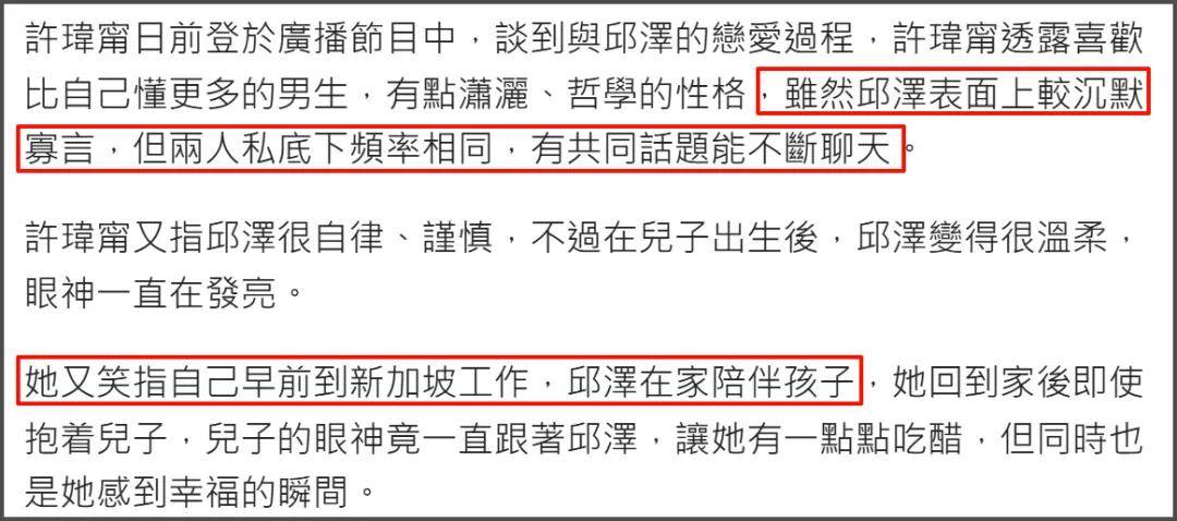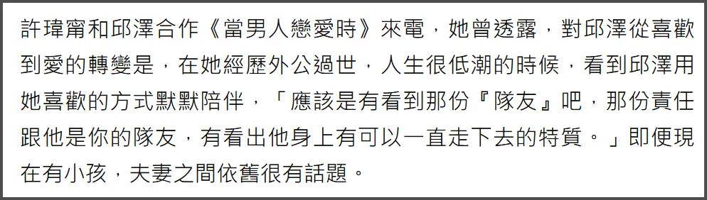许玮甯此前接受采访被问到和邱泽的相爱细节,许玮甯直言是因为外公过世时,她经历人生低谷,但邱泽默默陪伴,让她看到对方身上有“能一直走下去的特质”,觉得邱泽像“队友”一样有责任心,值得托付。
