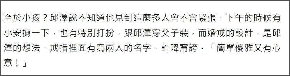 有媒体也注意到两人佩戴的婚戒,这对戒指亮相次数可不少,据说设计都是邱泽的想法,戒指里面刻有两人的名字,许玮甯对此也非常满意,觉得这样“简单优雅又很有心意!”