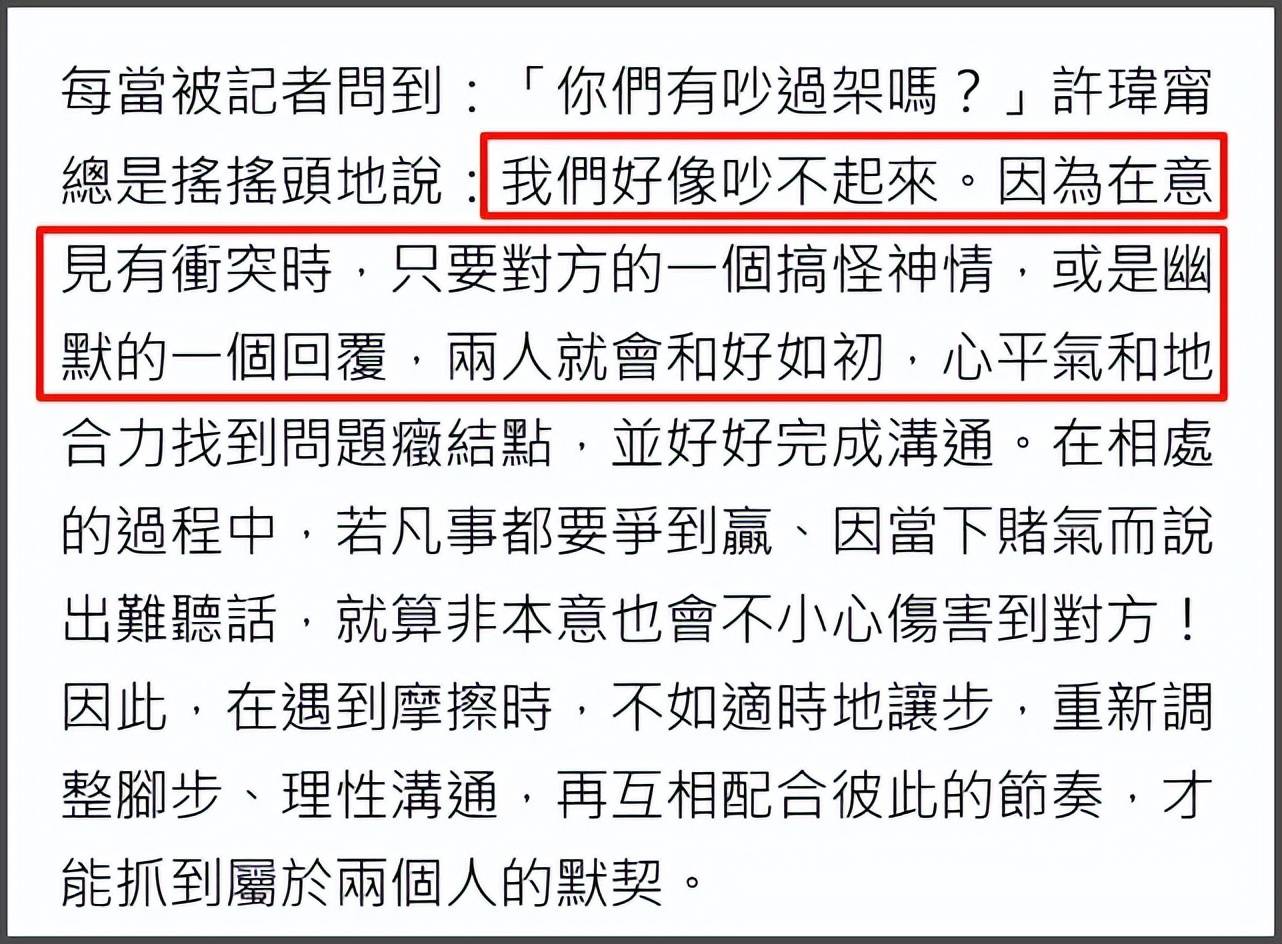 不过两人婚后也非常契合,很少吵架,还会一起做饭。同为演员的两人也有很多共同话题,在许玮甯忙工作的时候,邱泽也能在家带孩子,夫妻生活很合拍。