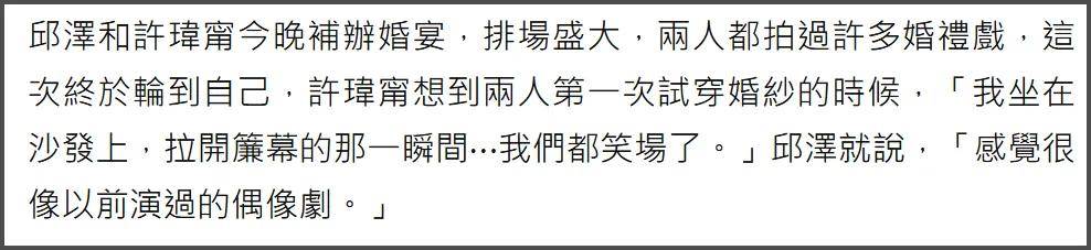 婚礼开始前有媒体拍到邱泽搂着许玮甯现身,邱泽看上去还有些紧张,脸很红,许玮甯打扮非常亮眼,开心和媒体互动打招呼。许玮甯分享第一次试婚纱的体验,试完拉开帘子两人都笑场了,邱泽直言像拍戏一样。