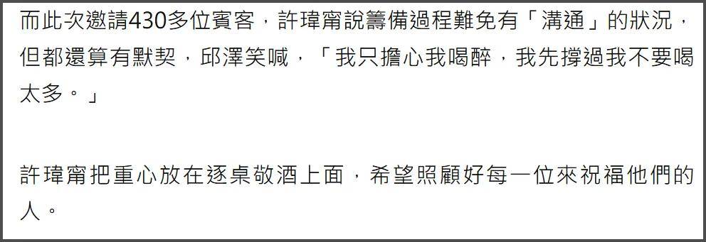谈及婚礼邀请430多位宾客到场,场面堪比“三金”颁奖礼,新郎官邱泽笑称只怕自己会喝多,多次强调“我只担心我喝醉,我先撑过我不要喝太多”,看来是做好当新郎被灌酒的准备了,而许玮甯则表示希望照顾到每一位来祝福他们的宾客。