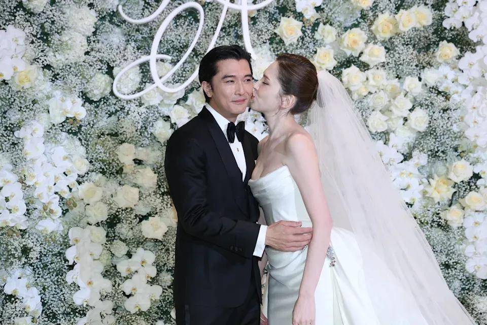 两人当着媒体的面互相拥吻,非常甜蜜,在媒体面前大秀恋爱,给足面子,婚礼整个氛围都很轻松。
