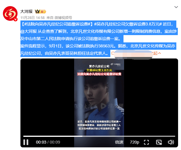 (来源:大河报)近日, 据企查查,北京凡世文化传媒有限公司新增一则限制消费信息,案由涉及中山市第二人民法院申请执行该公司追缴诉讼费一案。案件流程显示,9月1日,该公司被法院执行38