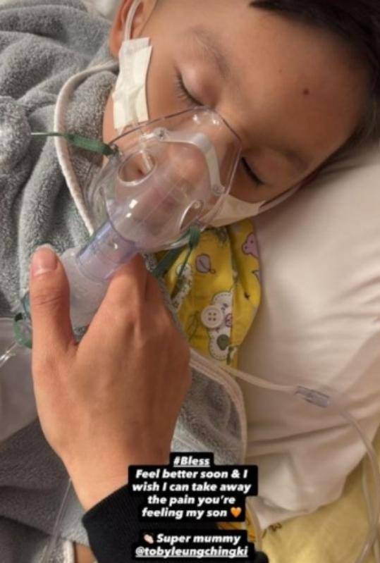 照片中梁靖琪的小儿子,一脸疲惫的躺在病床上,他双眼紧闭吸着氧气,看样子十分虚弱,令不少网民看后感到心疼。