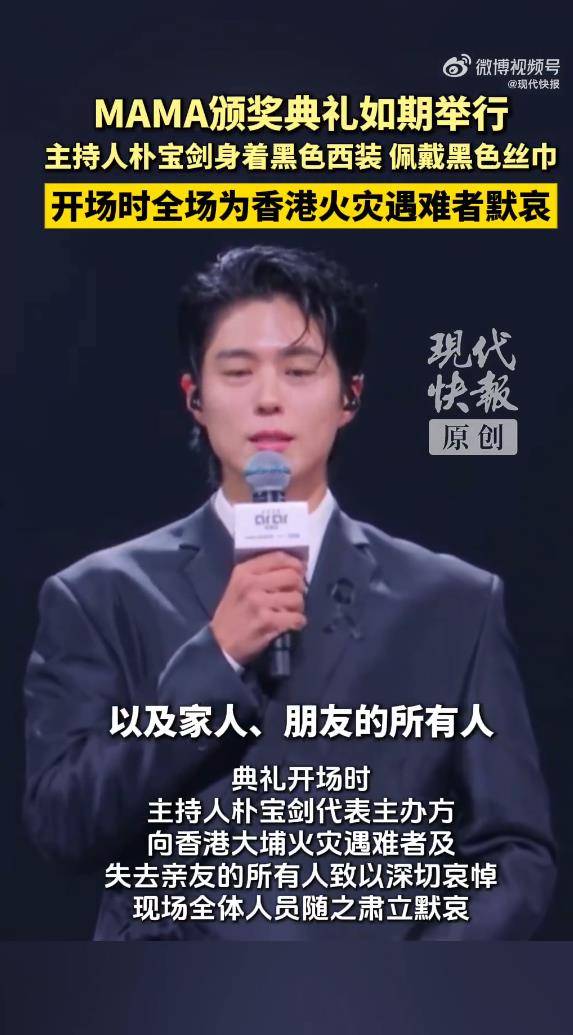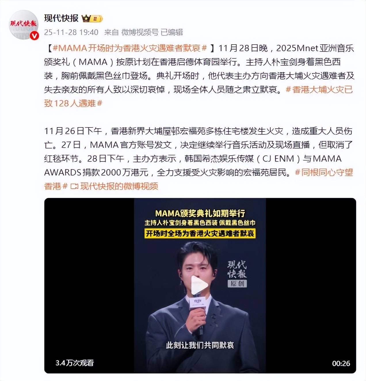 11月28日晚,2025Mnet亚洲音乐颁奖礼(MAMA)在香港启德体育园以一种出乎所有人意料的方式拉开帷幕。没有炫目的灯光和沸腾的欢呼,主持人朴宝剑一身黑色西装,胸前佩戴黑色丝巾登场,代表主办方为香港大埔火灾遇难者及失去亲友的所有人致以深切哀悼。随之,现场全体人员肃立默哀,将原定的娱乐盛典瞬间转变为庄重的哀悼现场。