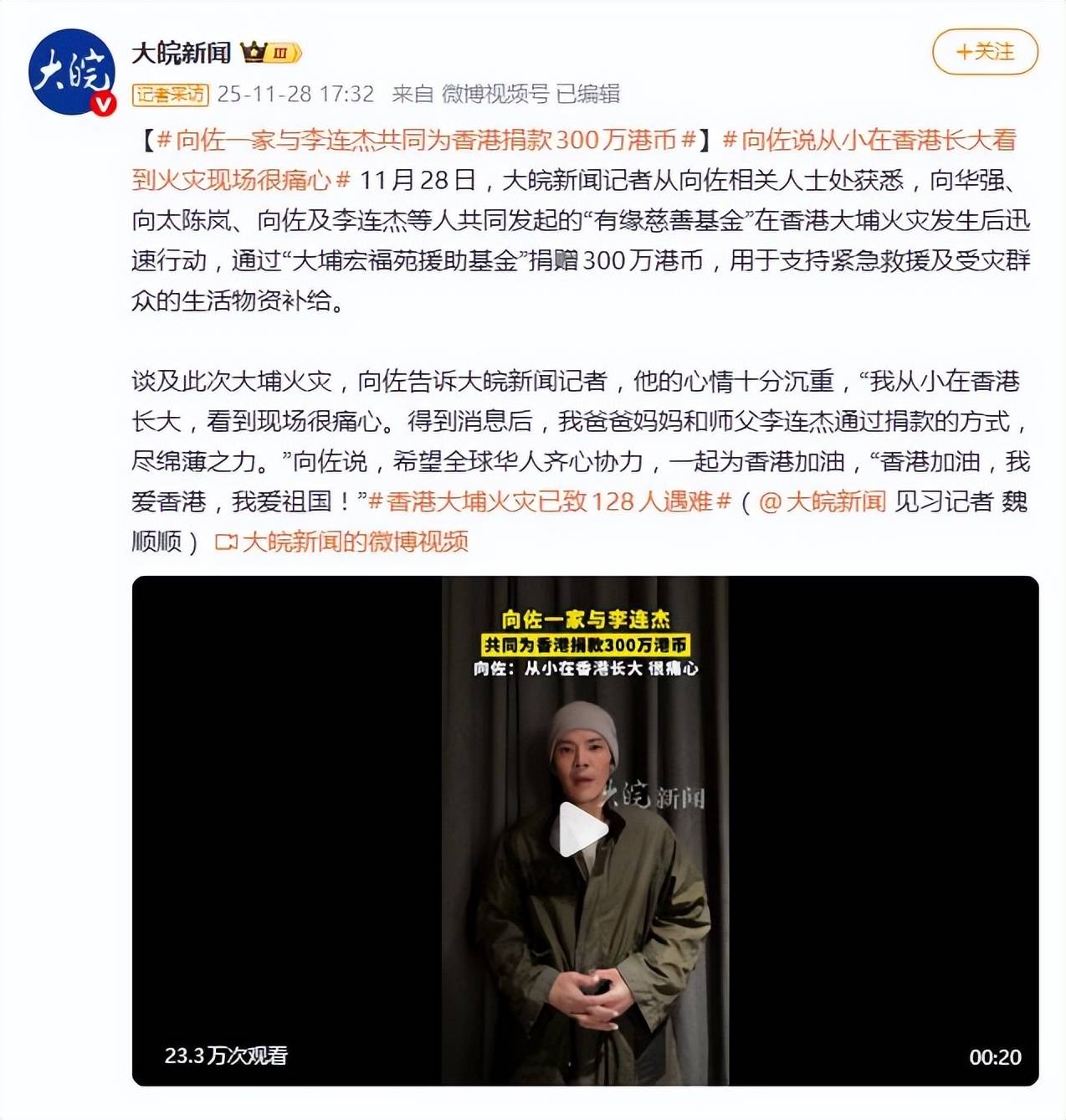 11月28日,一则“向佐素颜出镜谈及香港数度哽咽”的消息迅速登上热搜。原来,在香港大埔火灾发生后,向华强、向太陈岚、向佐及李连杰等人共同发起的“有缘慈善基