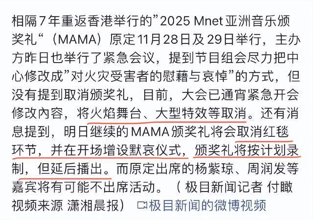 11月28日晚,香港启德体育园内灯光肃穆。当2025Mnet亚洲音乐大奖(MAMA)在冷色调光束中拉开帷幕,主持人朴宝剑胸佩黑色丝巾登场,代表主办方向香港火灾遇难者及家属致哀,现场千余名观众与艺人集体肃立默哀。这场原本狂欢的亚洲乐坛盛典,因突发灾难以克制庄重的方式重启——艺人被禁止穿着红色服装,所有含“火”歌词的曲目遭强制改编,而(G)I-DLE成员宋雨琦的中文发言,更成为整晚最触动人心的时刻。