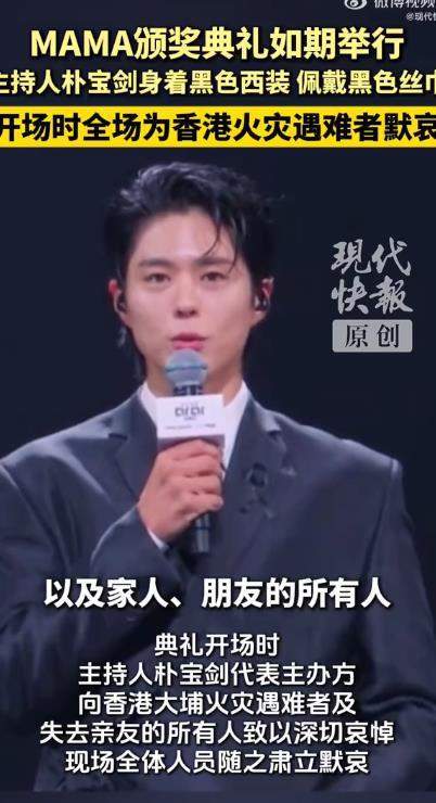 11月28日晚,香港启德体育园内灯光肃穆。当2025Mnet亚洲音乐大奖(MAMA)在冷色调光束中拉开帷幕,主持人朴宝剑胸佩黑色丝巾登场,代表主办方向香港火灾遇难者及家属致哀,现场千余名