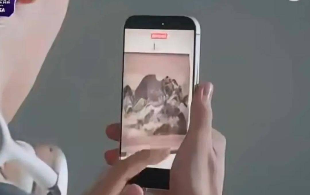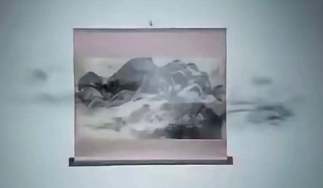 在一段短片中,屏幕上直接放映了一幅卷轴画作,上面就是传统的中国山水水墨画,画里没有人物。但从画轴及画幅来看,这装裱及大小就不是标准的中国特色。一般中国画都是长幅,不会是正方形。