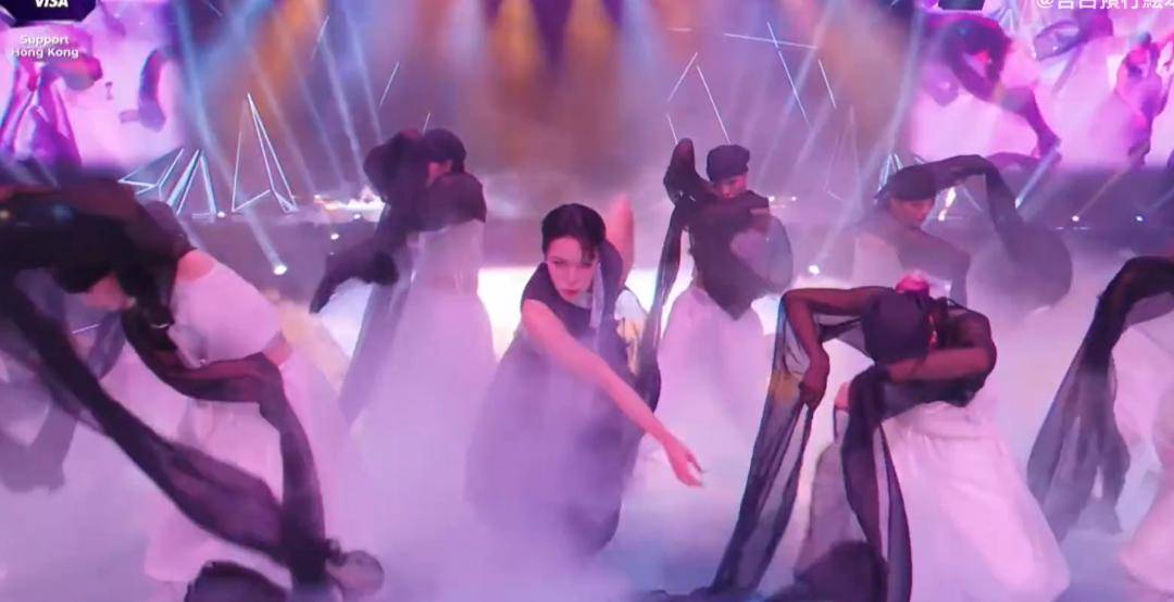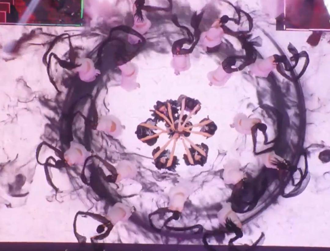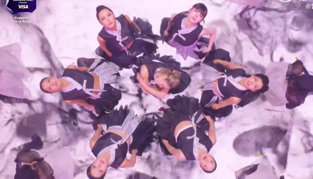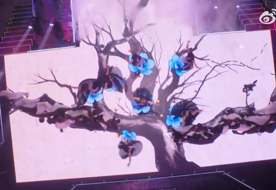而且,舞台背景造型都是以中国水墨画为核心,表演者服装选择深色为主浅色为辅的搭配,在灯光的映衬下,看起来就是黑白两色。但是碍于韩国舞台设计者的能力,舞台效果大打折扣,看起来并不是水墨画,而是一团乱,诡异又压抑。在表演过程中,背景音乐还添加了笛声,想要传达出悠扬婉转的声音。