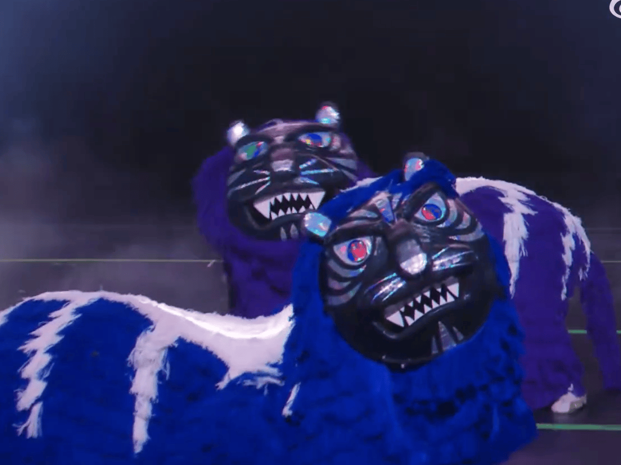 舞狮是中国特有的传统文化,狮子也主要以鲜艳的颜色为主,狮头都很灵动,特别是眼睛。在MAMA的舞台上,韩国人选了两只蓝色狮子,狮头审美并不符合中国人,眼睛、嘴巴都画得奇奇怪怪,还有猫咪胡子,略微有些恐怖。