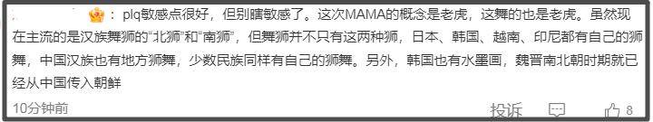 看到舞狮出现,有网友认为这是明目张胆的偷,韩娱粉丝们则着急辩解,解释称舞台上那对狮子表演并不是舞狮,MAMA主题是“老虎”,整个舞蹈都是根据老虎编排的,包括面具也是形似老虎。但狮子和老虎就不是一个长相,而且狮子的行为动作和老虎也不一样,MAMA舞台上的表演完全是按照舞狮进行的编排。