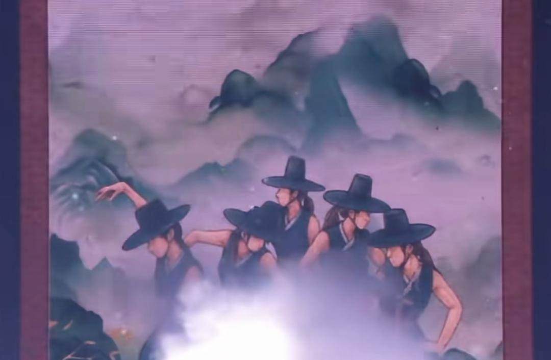 紧接着开场表演,镜头先给到了舞台中央的一幅山水水墨画背景,画作上有远山及几个戴着古装帽子的女性。要知道,山水画是中国特有的独一份的技能,韩国并没有这项文化,但却硬生生在画上画了几个穿韩服的女性,不是擦边就是明显的“偷”。