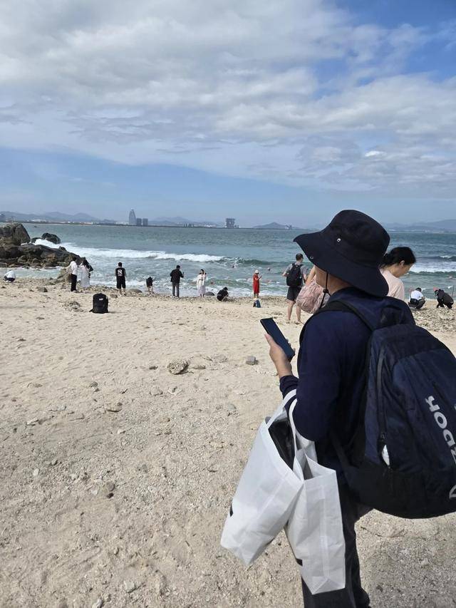 照片里郭爸爸独自在沙滩上散步,手里还拿着一串刚买的烤鱿鱼,看起来精神头不错。