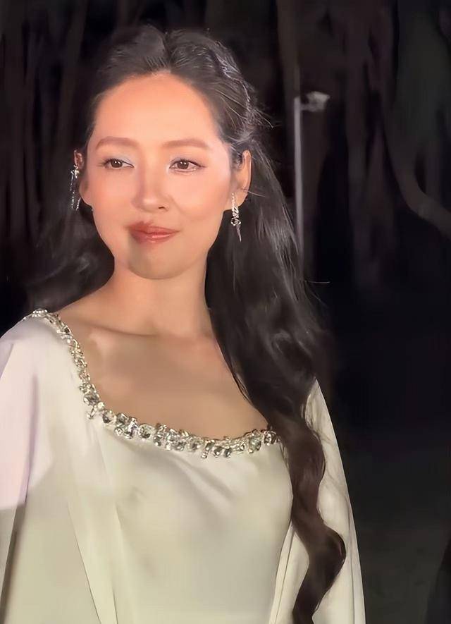 她身穿白色长裙搭配羽毛披肩,看起来确实挺华丽的,但是不少人说她太富态了,面部状态也有些发福,完全没有了女明星的气质。