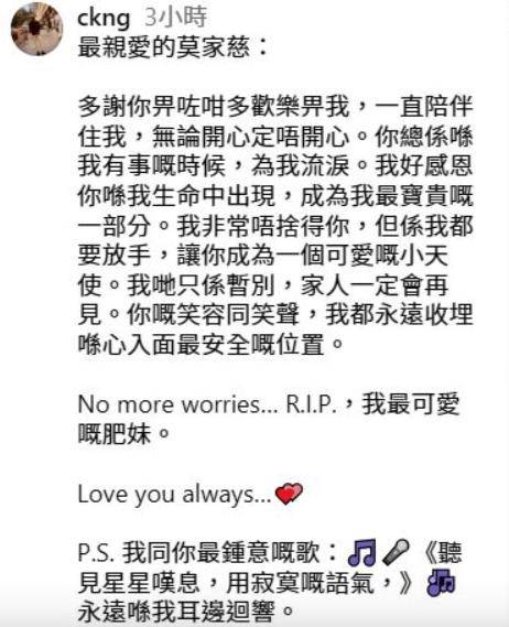 刘嘉玲的前助手晒出与莫家慈的合照,写道:“最亲爱的莫家慈,谢谢你带给我这么多欢乐,一直陪伴着我,不管是开心还是不开心的时候。你总是在我遇到困难时,为我难过流泪。我很感恩你出现在我的生命里,成为我最珍贵的一部分。我真的非常舍不得你,但还是要放手,让你变成一个可爱的小天使。我们只是暂时分别,家人总有一天会再相见。你的笑容和笑声,我会永远珍藏在心里最安全的地方。再也没有烦恼了…… 愿你安息(R.I.P.),我最可爱的肥妹。永远爱你…… ”