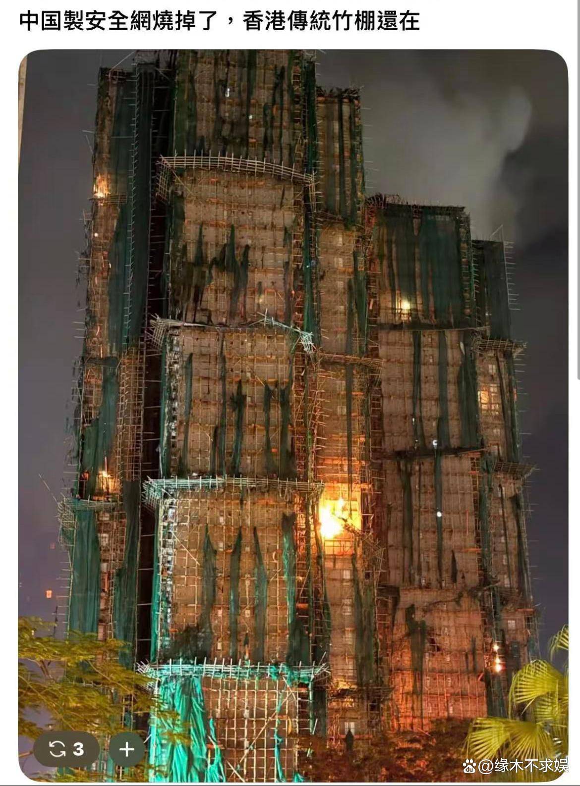 事实上,不仅是黄秋生的评论区,香港多处网络平台都能见到力挺竹协会的声音。一名网友甚至嘲讽内地网友,称内地制作的安全网早已焚毁,香港传统竹棚却依旧屹立不倒。然而这一说法很快被事实打脸——火灾最先点燃的大厦外的竹棚早已被烧得一干二净,大火中还能听见竹子燃烧时噼里啪啦的声音。由此可见,“竹子阻燃”的说法并无科学依据。
