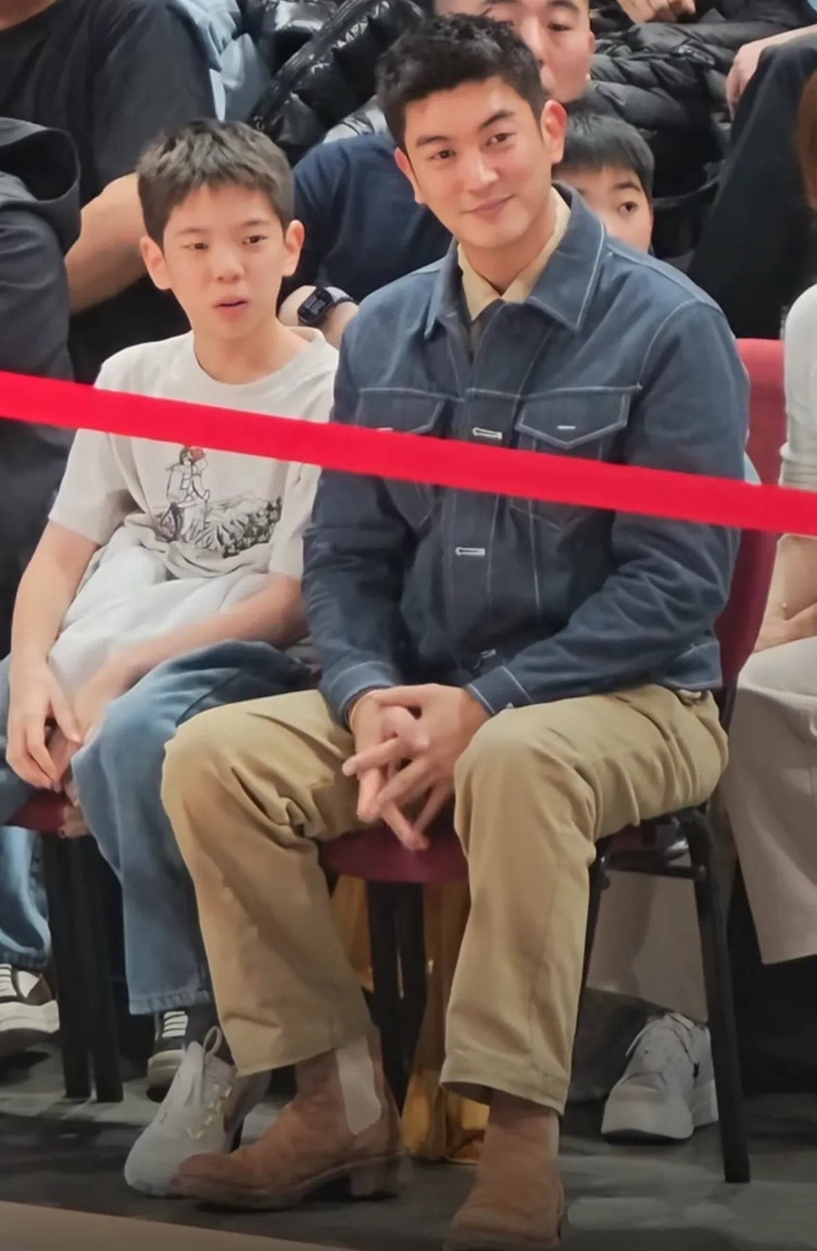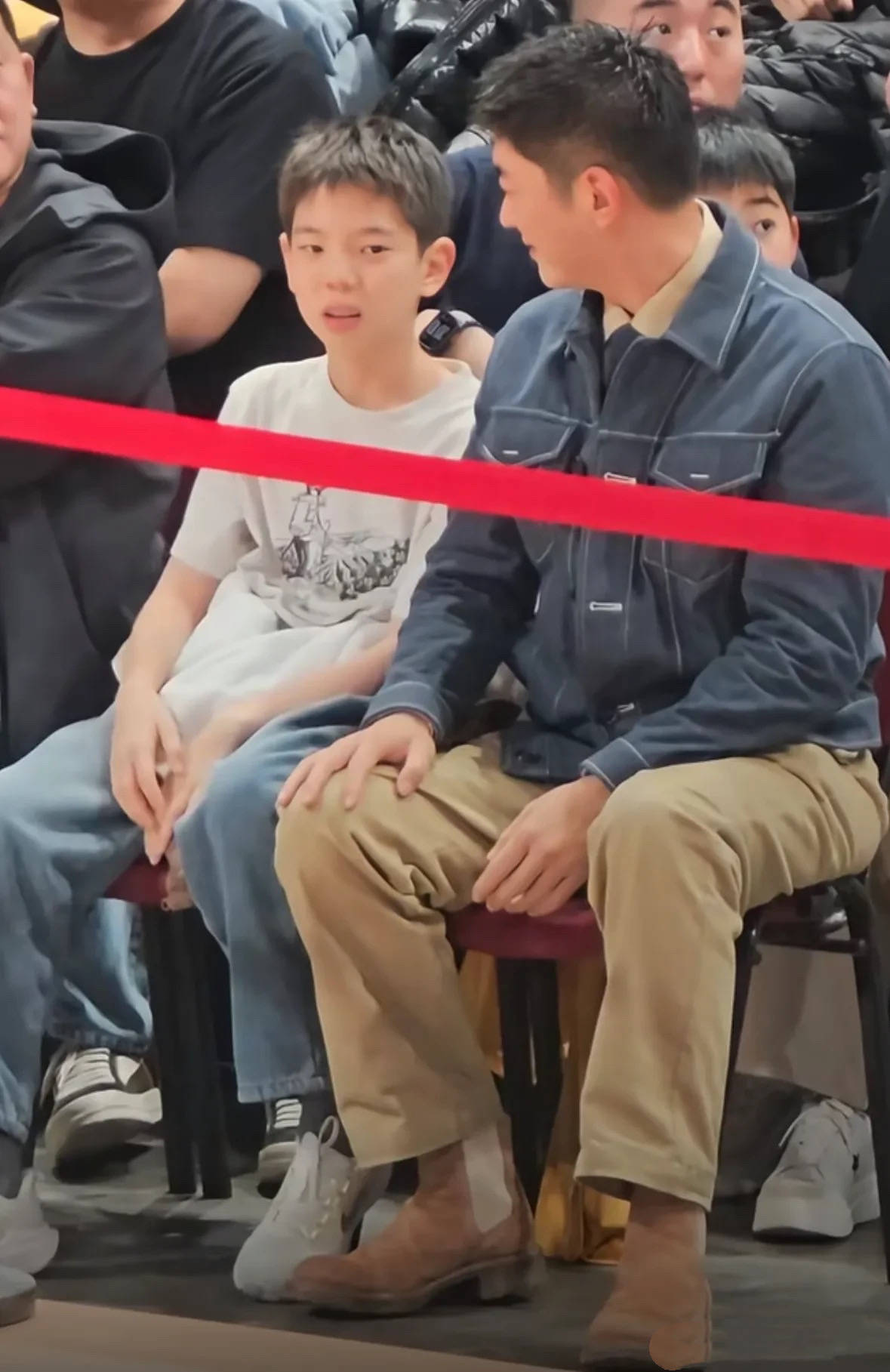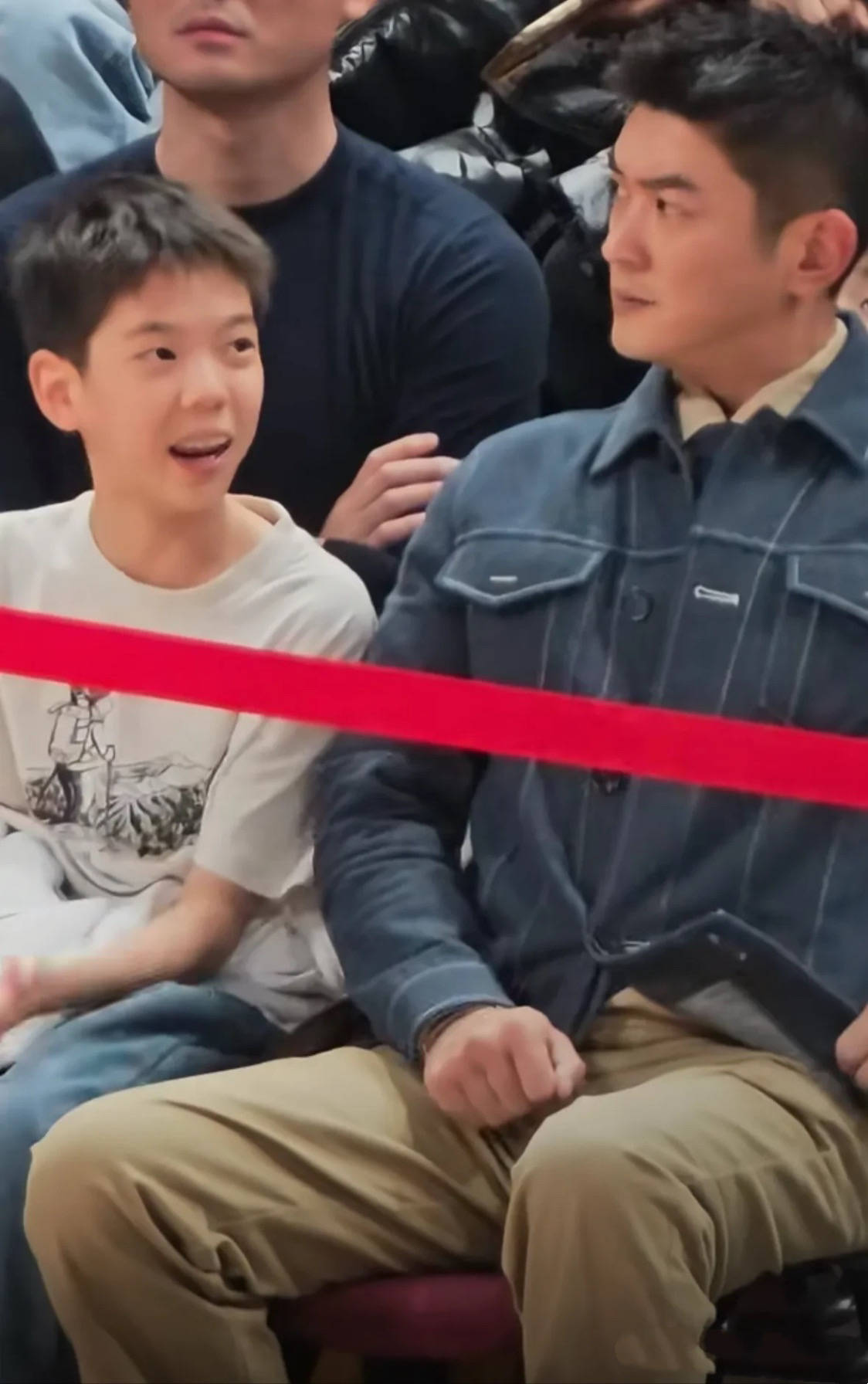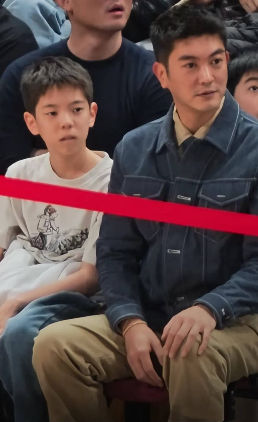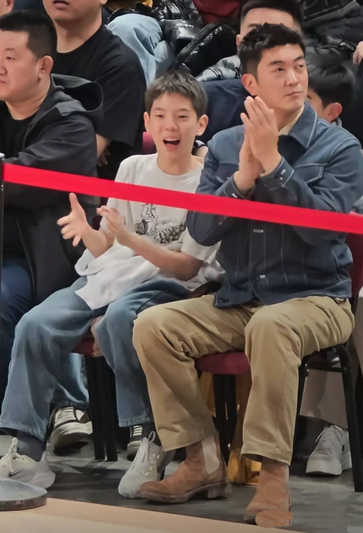 杜江陪着嗯哼一起看球赛,父子俩也一直在交流。杜江还是一如既往的挺拔帅气,他穿了蓝色牛仔外套、卡其色直筒裤,内搭是翻领衬衫。