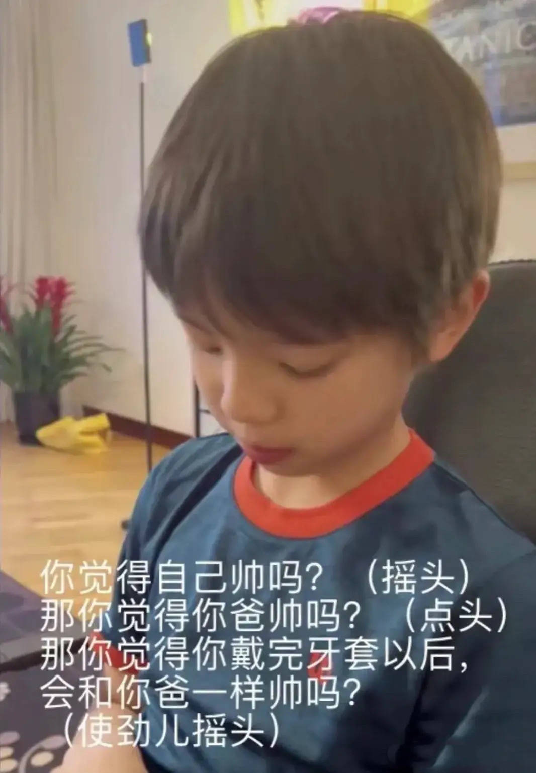 对于自己的颜值,嗯哼也是比较不自信。被问到“你觉得自己帅吗”的时候,嗯哼摇头。问“你觉得你爸帅吗”?的时候,他点头。问你觉得戴完牙套会像爸爸一样帅吗的时候,嗯哼还是摇头。