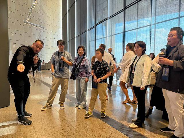 一行人还在博物馆前聊得欢,朗朗还拿出手机不停的拍,妈妈在旁边笑。