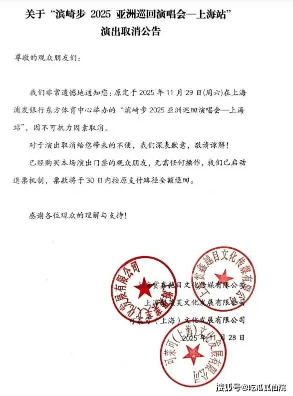 昨晚,一则让众多粉丝心碎的消息传来:原计划于29日晚盛大举行的日本歌手滨崎步上海演唱会,突然宣布取消。这一突如其来的变故,犹如一颗重磅炸弹,在粉丝群体中掀起了轩然大波。