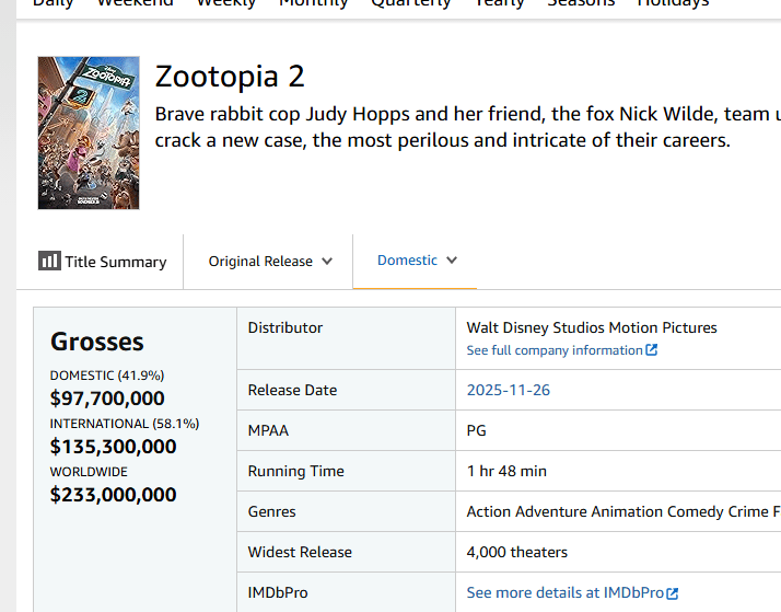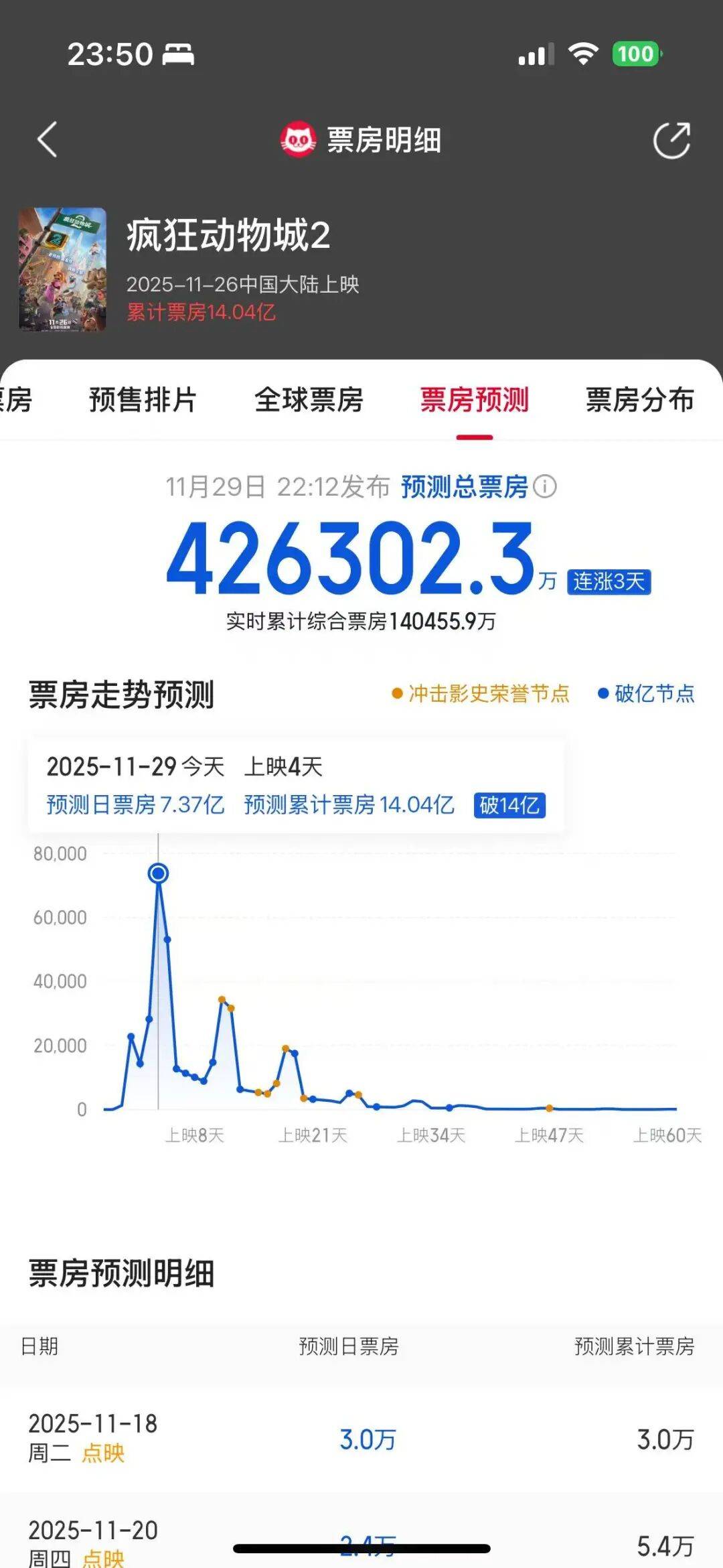 在12月竞品《阿凡达3》上映前,《疯狂动物城2》基本无对手,超高上座率(非黄金场次超90%)支撑票房后劲,有望冲击50亿量级。