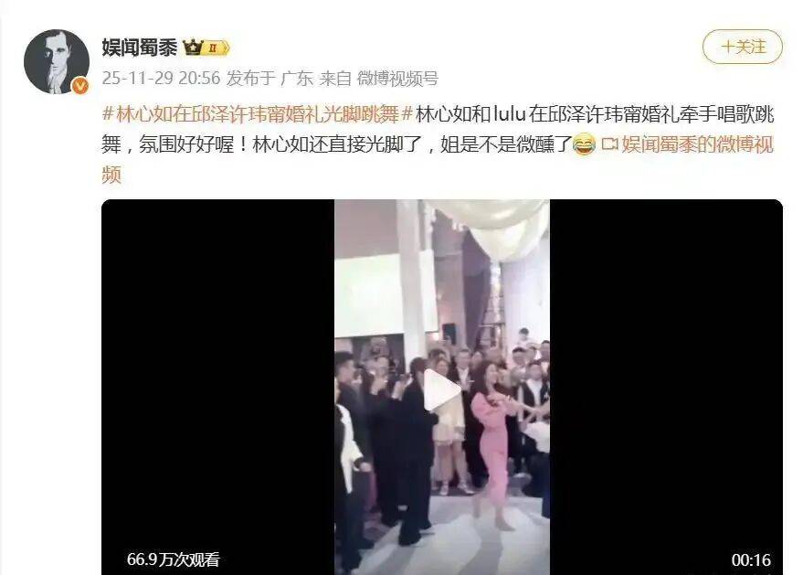 在2025年11月28日邱泽许玮甯台北补办婚礼晚宴中,主持人Lulu(陈汉典妻子)临时邀请林心如共舞。她当即脱掉粉色高跟鞋赤脚登台,随性牵Lulu的手即兴扭动腰肢,笑容灿烂带动全场欢快氛围。