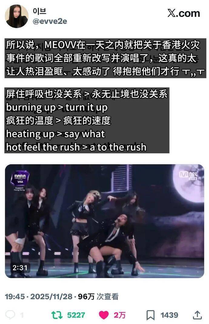 令人意外的是,最先化解这一难题的竟是两个年轻女团。MEOVV原定表演的热门曲目《BURNING UP》中,“燃烧”一词反复出现,在火灾事故的阴影下显得尤为敏感。然而这群女孩用行动证明了她们的应变能力:表演时,她们将歌词改为“振作起来”。成员Narin和Gawon特意提高声调唱出改编后的歌词,既保留了舞台感染力,又巧妙避开了争议点。