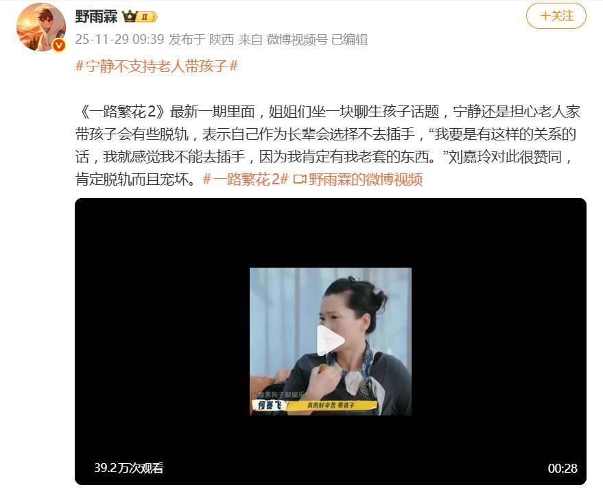 据网友11月29日报道,综艺《一路繁花2》里,姐姐们聊起育儿话题,宁静一句“担心老人家带孩子会有些脱轨”的观点,瞬间在网络上炸开了锅。这位向来快人快语的姐姐,这次直接把“隔代育儿”的争议搬上了台面。