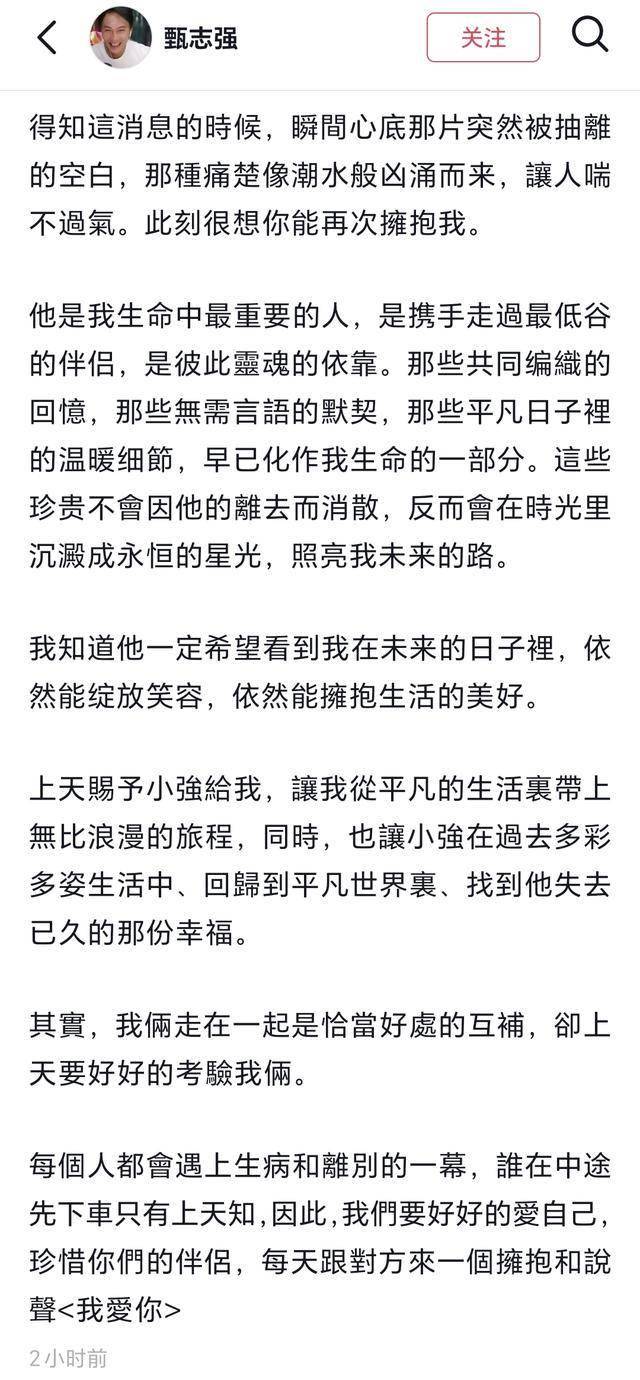 据悉,甄志强生前很注重隐私,一直没有公开感情状况。直到去世后,大家才从讣告中知晓他的真实婚姻关系。也是从那时候开始,方心媛通过社交账号抒写对他的思念之情。