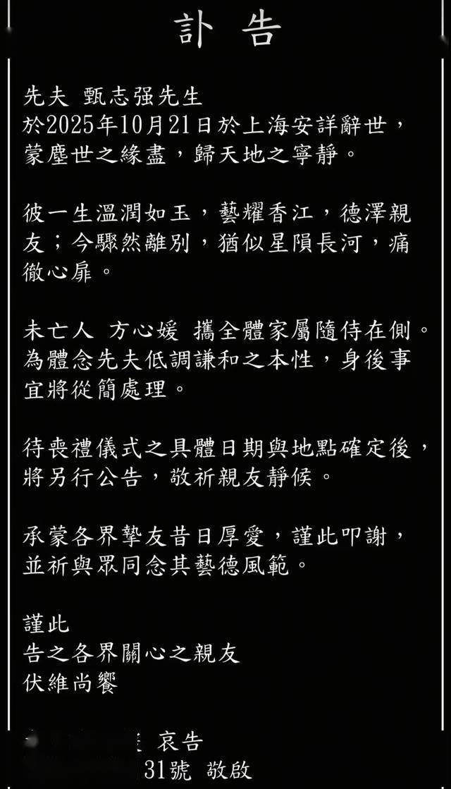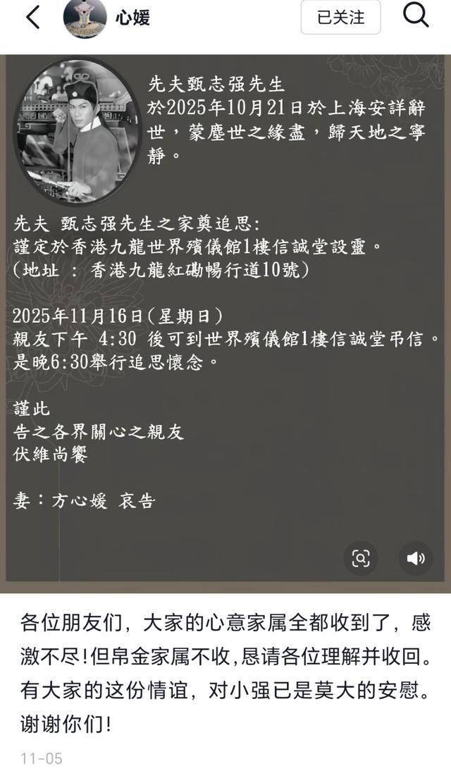 10月21日,有着“最帅展昭”之称的甄志强骤世,享年59岁。10天后,他老婆方心媛在社交账号发布讣告,外界感到震惊、痛心。11月5日,方心媛公布他的追思会时间,定在11月16日